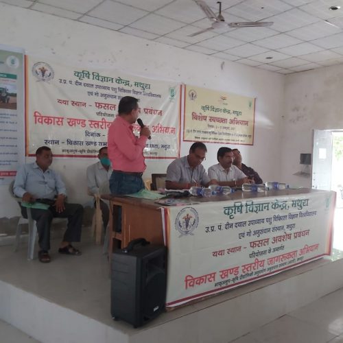 उत्तर प्रदेश पंडित दीनदयाल उपाध्याय पशु चिकित्सा विज्ञान विश्वविद्यालय एवम गौ अनुसंधान संस्थान मथुरा के अधीन कार्यरत कृषि विज्ञान केंद्र मथुरा द्वारा आज दिनांक 21 अक्टूबर 2021 को माननीय कुलपति प्रोफेसर जी.के. सिंह एवं डॉ एस के मिश्रा वरिष्ठ वैज्ञानिक एवं अध्यक्ष के दिशा निर्देशन में विकासखंड छाता के सभागार में विकासखंड स्तरीय फसल अवशेष प्रबंधन पर कृषक जागरूकता अभियान का कार्यक्रम आयोजित किया गया जिसमें 90 से अधिक किसानों एवं छाता खंड के ग्राम प्रधानों ने भाग लिया । कार्यक्रम की अध्यक्षता विकासखंड छाता के विकास खंड अधिकारी श्री विजय कुमार जी के द्वारा की गई।