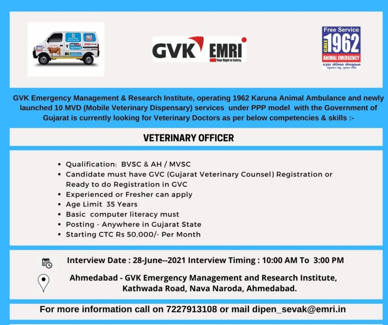 01/04/2021 : Job Opportunities for Veterinary Officer in GVK EMRI , Gujrat (PN-81/2021)